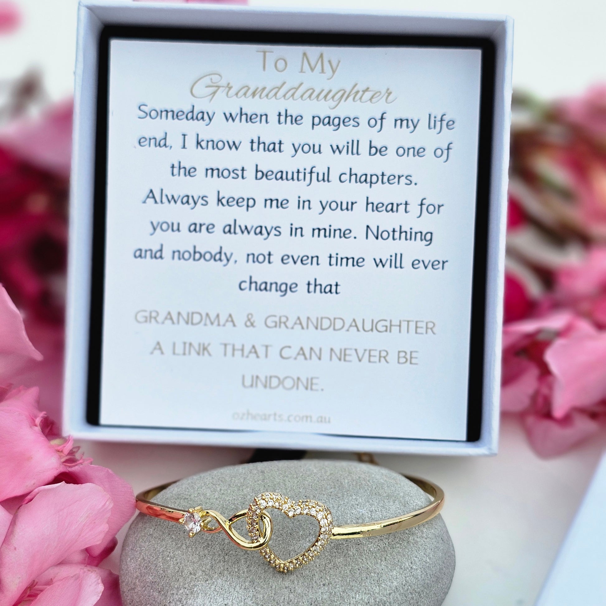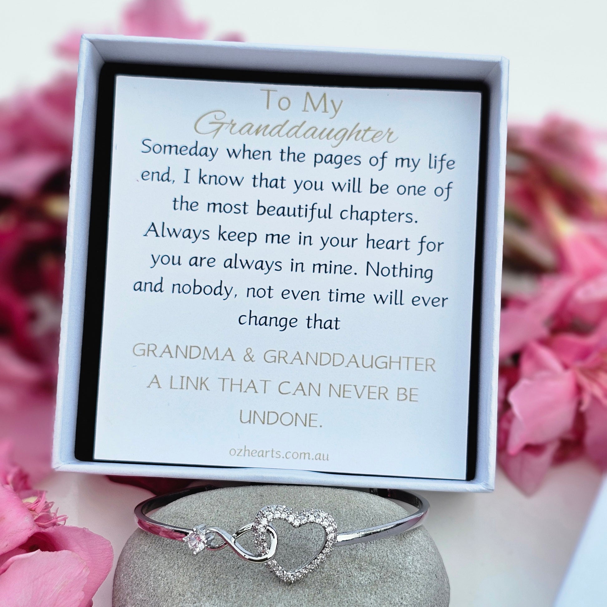 Give your granddaughter a heartfelt gift she will treasure forever with the Infinity Heart Bracelet. This beautifully crafted bracelet features an elegant infinity symbol intertwined with a delicate heart, representing the unbreakable bond between you and your daughter. It is designed to complement any style and occasion.